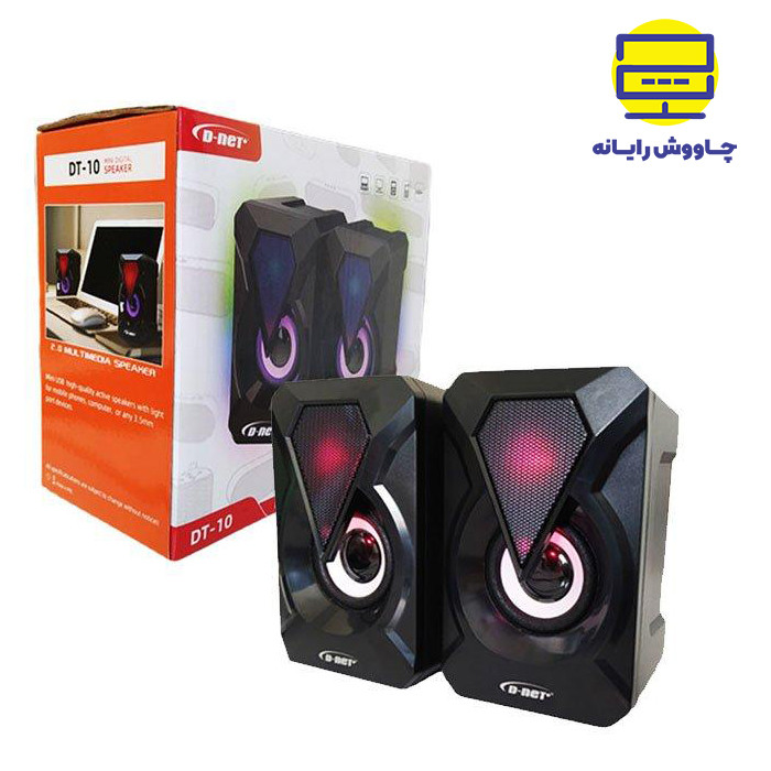 اسپیکر دسکتاپ دی-نت DT-10 دو تکه دی نت قابلیت اتصال به لپ تاپ و کامپیوتر را دارد و دارای نور پردازی زیباییست که جذابیت محصول را دو چندان کرده و برای مصارف خانگی مناسب است.